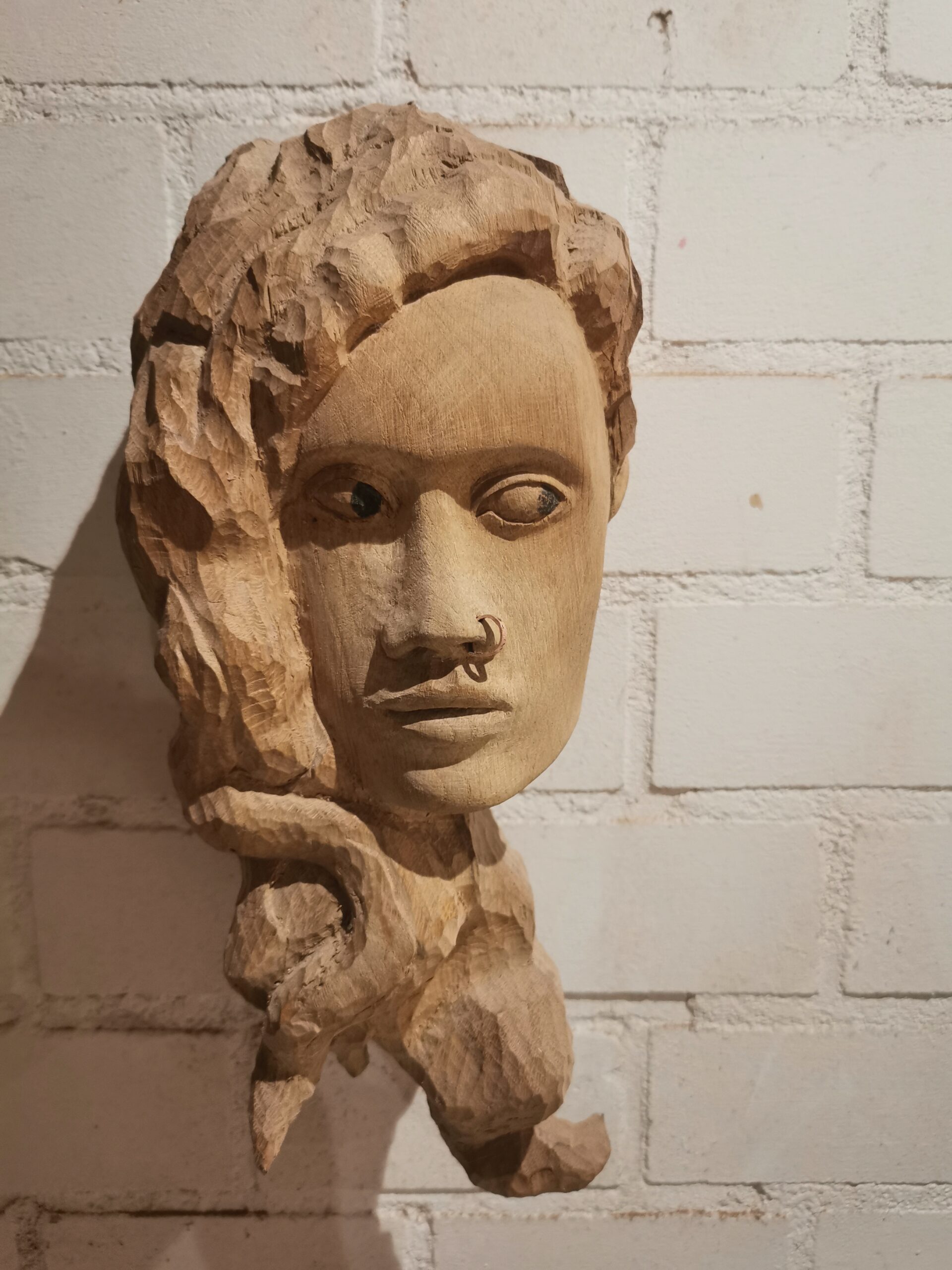 Ik heb in eikenhout een portret gemaakt van Iris, een jonge vrouw uit Amsterdam met wild krullend haar. Zo wordt door haar familie regelmatig er op gewezen dat haar haar niet ‘netjes’ zit en dat ze het moet invlechten of opsteken. Dit doet ze tegenwoordig niet meer en draagt haar haar natuurlijk. Dit is voornamelijk te wijten aan een generatiekloof.